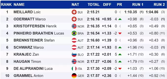 Третью победу в текущем сезоне Кубка мира оформил швейцарский спортсмен Лоик Мейяр. На второй позиции оказался Марко Одерматт, проигравший 0.95 секунд лидеру. В тройку лучших вошел норвежец Хенрик Кристофферсен.