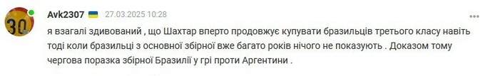 avk2307: я вообще удивлен, что Шахтер упорно продолжает покупать бразильцев третьего класса даже тогда, когда бразильцы из основной сборной уже много лет ничего не показывают. Доказательством тому является очередное поражение сборной Бразилии в игре против Аргентины.
