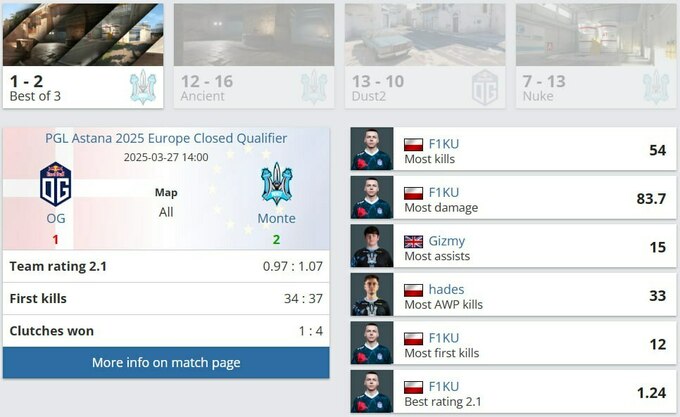 Украинский клуб Monte начал свой путь в закрытой квалификации PGL Astana с победы над датским составом OG. Серия завершилась со счетом 2:1, и Monte смогли переломить ход матча после проигранной второй карты.