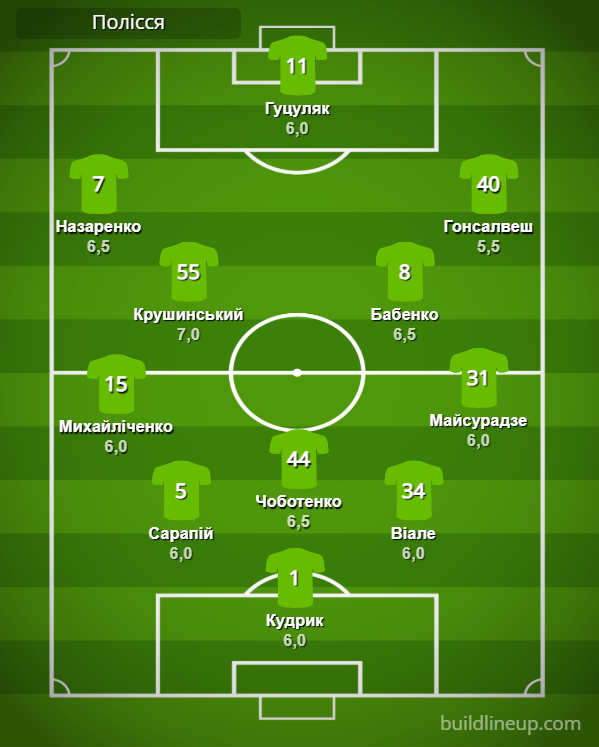 «Полесье»: Кудрик – Михайличенко, Сарапий, Чоботенко, Виале, Майсурадзе (Тейлор, 87) – Назаренко (Бристрич, 86), Крушинский (Битон, 64), Бабенко, Гонсалвеш (Батиста, 64) – Гуцуляк (Мельниченко, 90+2).