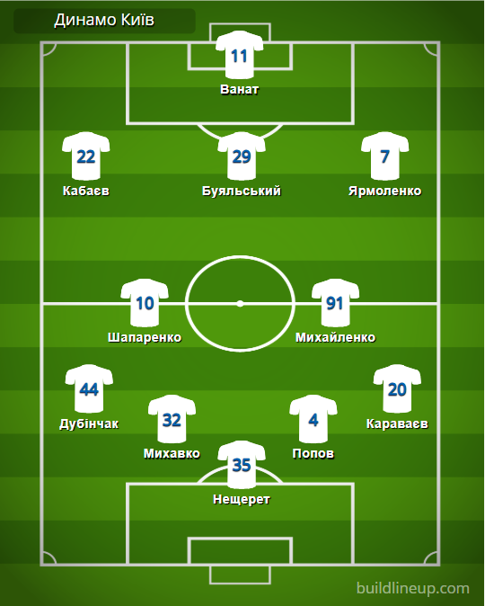 «Динамо» Киев: Нещерет – Дубинчак, Михавко, Попов (Биловар, 80), Караваев – Шапаренко (Рубчинский, 70), Михайленко – Кабаев, Буяльский (Пихаленок, 70), Ярмоленко (Волошин, 76) – Ванат (Герреро, 70).