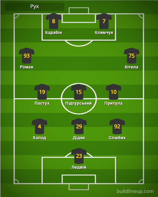 «Рух»: Ледвий – Холод (Алмазбеков, 77), Дидык, Слюбик – Роман (Калинец, 86), Пастух, Пидгурский (Тлумак, 77), Притула (Эдсон, 57), Китела – Карабин (Рябов, 57), Климчук.