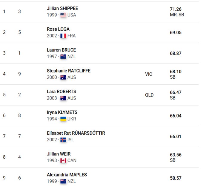 Украинка заняла шестую позицию с результатом 66.04 метра. Чемпионкой стала американка Джиллиан Шиппи - 71.26 м, второе место заняла Роуз Лога (Франция) - 69.05, а бронзу взяла австралийка Лорен Брюс (68.87).