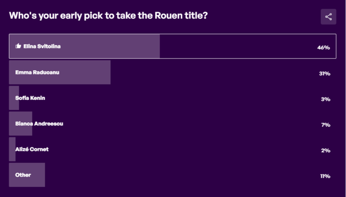 На сайте WTA открыт опрос: «Кто завоюет титул чемпиона в Руане?» – 46% опрошенных ценителей тенниса выбрали фаворитом Элину Свитолину.