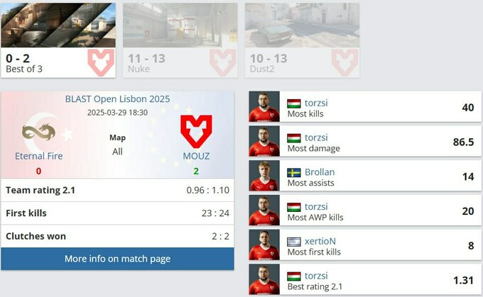 MOUZ обеспечили себе место в финале BLAST Open Lisbon после победы 2:0 над Eternal Fire, что стало их третьим финалом на трех турнирах с момента подписания Лотана «Spinx» Гиладзи.