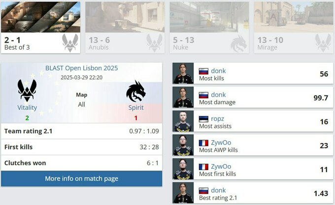 Vitality одолели Spirit в напряженном полуфинальном матче со счетом 2:1. Они уверенно выиграли Anubis (13:6), но потерпели разгромное поражение на Nuke (5:13), после чего добыли трудную победу на Mirage (13:10).
