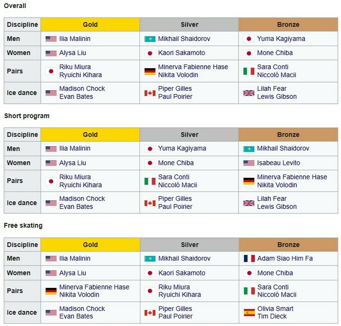 В соревнованиях были представлены все четыре олимпийских дисциплины: танцы на льду, спортивные пары, мужское и женское одиночное катание.