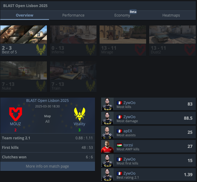 Команда Vitality завоевала титул чемпионов BLAST Open Lisbon, во второй раз за две недели обыграв MOUZ в гранд-финале. Однако в этот раз соперник оказал серьёзное сопротивление, а серия затянулась на все пять карт.