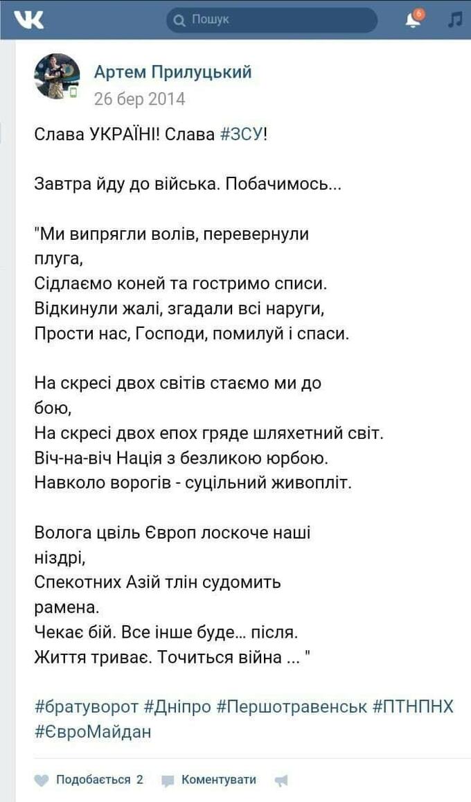 Этот родившийся в 1986 году в Першотравенске на Сичеславщине, в одном городе с Ярославом Ракицким, парень, выбивается из привычного шаблона большинства своих земляков. Артем сильно любил свой край, но видел его не таким, как подавляющее большинство его уроженцев. Видел украинским. Чтобы убедиться в этом, достаточно не полениться и промониторить соцсети человека, ставшего героем. Начиная с 2010-го, с момента регистрации в «Фейсбуке», Прилуцкий пользовался исключительно украинским и чествовал исключительно украинских героев и украинские памятные даты – День создания Украинской повстанческой армии, Василия Стуса, Романа Шухевича, Степана Бандеру, годовщину Голодомора.