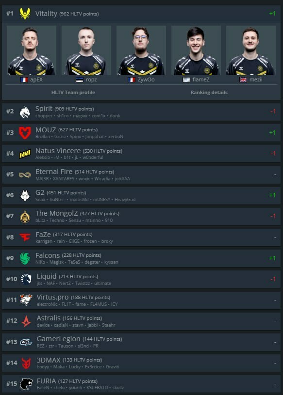 Главным достижением этого обновления стало восхождение Vitality на первую строчку мирового рейтинга. Французско-европейский коллектив поднялся на +1 позицию, обогнав Spirit, которые теперь занимают второе место (-1 позиция).