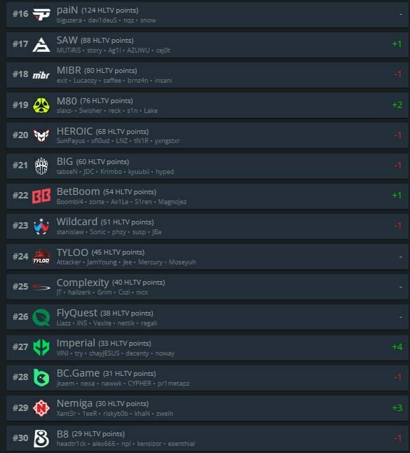 Далее в рейтинге Virtus.pro и Astralis остались на своих местах, а GamerLegion и 3DMAX не изменили своих позиций. Замыкает топ-15 команда FURIA, закрепившаяся на последней строчке рейтинга.