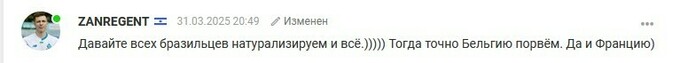 ZANREGENT: Давайте всех бразильцев натурализируем и всё.))))) Тогда точно Бельгию порвём. Да и Францию)