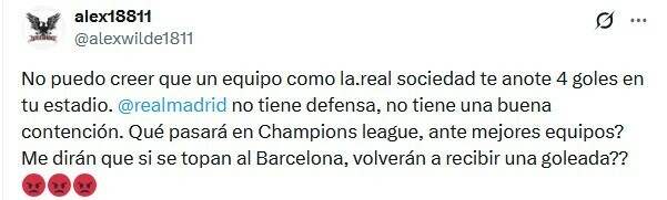 alex18811: Я не могу поверить, что такая команда, как «Реал Сосьедад», забивает вам 4 гола на вашем стадионе. Реал Мадрид не имеет защиты, не имеет хорошего удержания мяча. Что будет в Лиге чемпионов против лучших команд? Если они встретятся с Барселоной, то снова получат разгром?