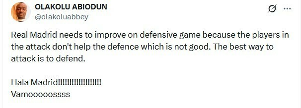 OLAKOLU ABIODUN: Реал Мадрид должен улучшить игру в обороне, потому что игроки в атаке не помогают обороне, что нехорошо. Лучший способ атаковать – защищаться.