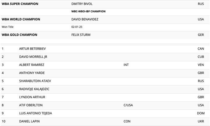 Лидером рейтинга является абсолютный чемпион мира в полутяжелом дивизионе Дмитрий Бивол.