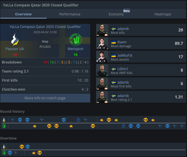 Овертаймы оказались короткими: Metizport выиграли 2 раунда подряд и завершили матч в свою пользу 14:16.