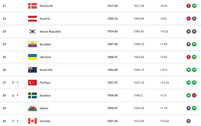 Подопечные Сергея Реброва в марте обменялись победами с Бельгией в плей-офф Лиги наций (3:1, 0:3). «Сине-желтые» имеют в своем активе 1559,81 балла и продолжают занимать 25-е место. Подопечные Руди Гарсии также сохранили свою позицию, они идут на восьмой строчке.