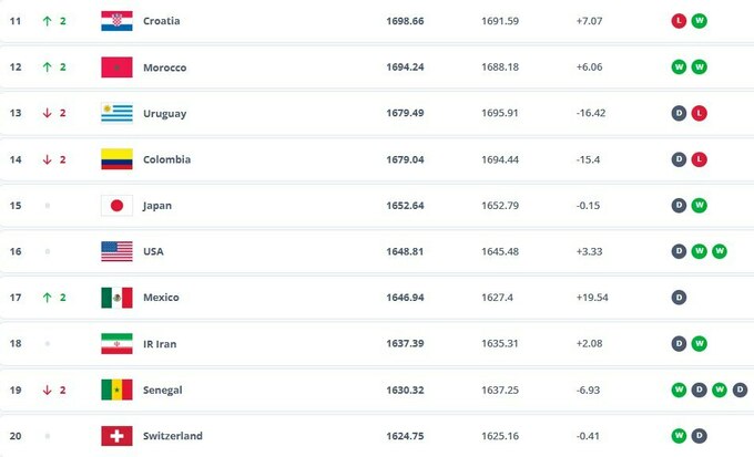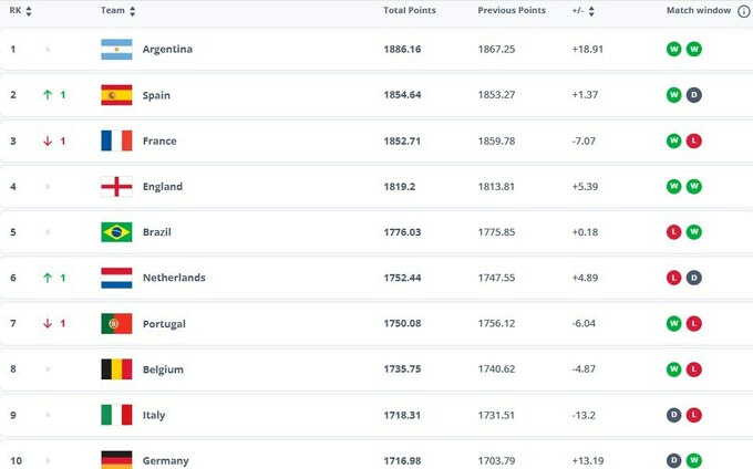 В первой десятке произошло несколько изменений – Испания опередила Францию в битве за второе место, а Нидерланды обошли Португалию и теперь разместились на седьмой позиции. Возглавляет рейтинг сборная Аргентины, которая заработала 1886,16 балла.
