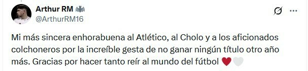 Arthur RM: Мои самые искренние поздравления болельщикам «Атлетико», «Чоло» и «Колхонерос» с невероятным подвигом: они не выиграли ни одного титула в течение еще одного года. Спасибо, что заставили мир футбола так смеяться.