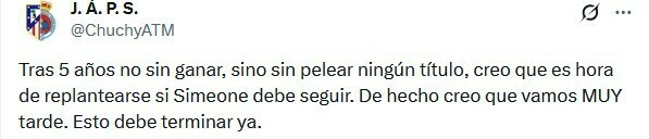 J. Á. P. S.: После 5 лет не без побед, но и без борьбы за какой-либо титул, я думаю, пришло время пересмотреть, стоит ли Симеоне продолжать карьеру. На самом деле я думаю, что мы ОЧЕНЬ опоздали. Это должно закончиться сейчас.