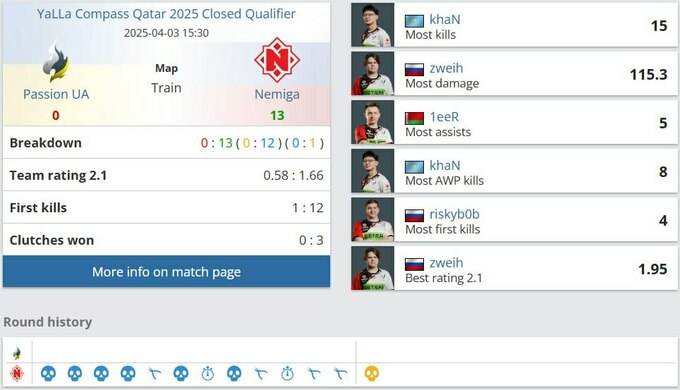 Украинский клуб Passion UA потерпел сокрушительное поражение от российского состава Nemiga в матче группы A на YaLLa Compass Qatar. Матч завершился со счетом 0:13, и это уже второй раз в истории команды, когда она не смогла взять ни одного раунда.