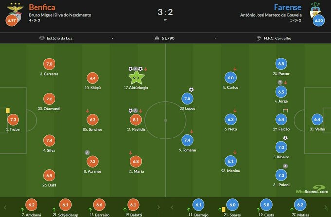 Оценка матча «Бенфика» – «Фаренсе» от WhoScored