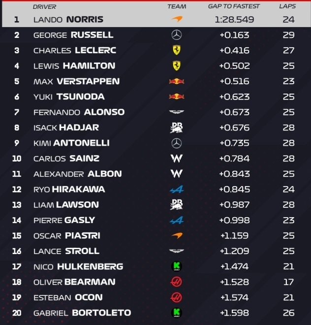 Как и ожидалось, преимущество сохраняет Макларен, а лучшее время в первой тренировке показал Ландо Норрис, который опередил Джорджа Расселла на Мерседесе и Шарля Леклера на Феррари. При этом Леклер отстал на 0,4 секунды.
