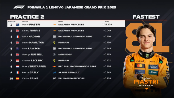 Главным событием стал дебют в составе Ред Булла Юки Цуноды. И пилот на домашнем автодроме показал уровень – японец закончил практику 6-м и лишь немного отстал от Макса Ферстаппена.