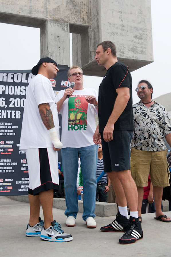 Вскоре на сцену поднялся претендент, первый номер рейтинга WBC Крис Арреола. Чемпион все же задержался на несколько минут поприветствовать соперника и пожелать ему удачи, что вызвало у американца снисходительную улыбку. Впрочем, главная встреча пройдет в субботу…