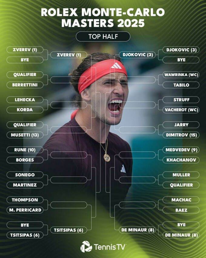 Первым сеяным в этом сезоне идет Александр Зверев. Второй – Карлос Алькарас. Зверев, Алькарас и еще шесть сеяных пропустят первый раунд.