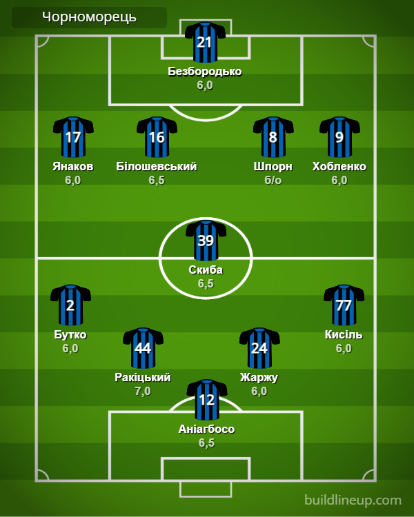 «Черноморец»: Аниагбосо – Бутко, Ракицкий (Райан, 66), Жаржу, Кисель – Скиба – Янаков (Габелок, 66), Белошевский, Шпорн (Лацабидзе, 5), Хобленко – Безбородько (К. Попов, 66).