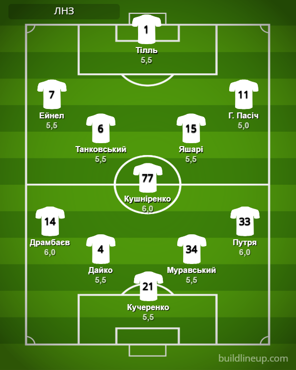 ЛНЗ: Кучеренко – Драмбаев (Топалов, 68), Дайко, Муравский, Путря – Кушниренко (Момо, 46) – Эйнел (Беннетт, 46), Танковский (Авагимян, 79), Яшари, Г. Пасич (Молло, 46) – Тилль.