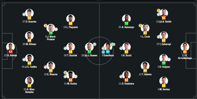 Украинский защитник «Борнмута» Илья Забарный провел н поле 76 минут результативными действиями не отличился. Илья мог збить, но после его удар мяч попал в каркас ворот. Статистические порталы SofaScore и WhoScored оценили игру украинца в 6.7 балла. Лучшим игроком оба статистических портала признали страйкера гостей Эванилсона: на его счету дубль и оценки 8.7 и 8.0.