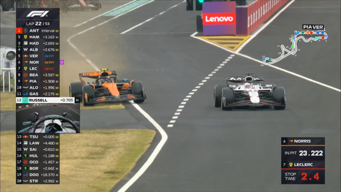 Единственная борьба между Максом и Ландо развернулась в боксах, когда они одновременно заехали на пит-стоп, а на выезде британец по траве пытался пройти конкурента, однако успеха не добился.
