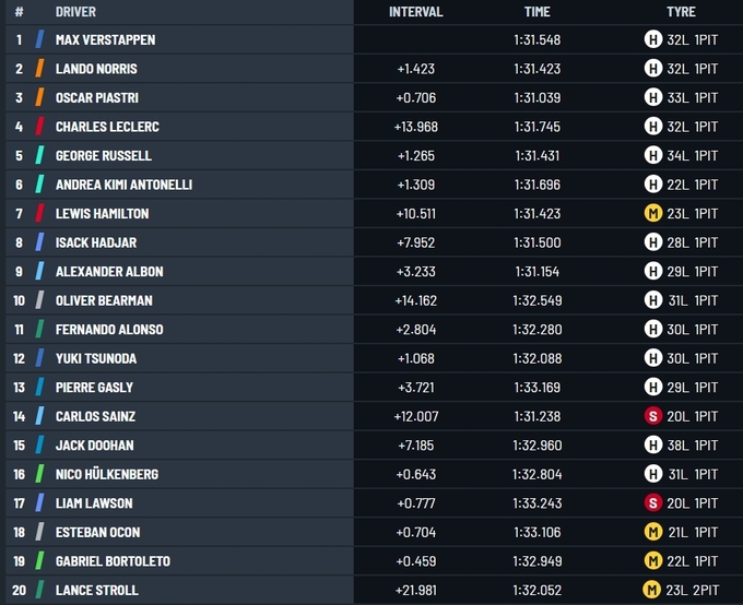 Были ожидания, что в течение гонки Макларен сможет реализовать свое преимущество в работе с резиной, но Ферстаппен спокойно держал дистанцию и не позволил Норрису ни одной серьезной атаки.