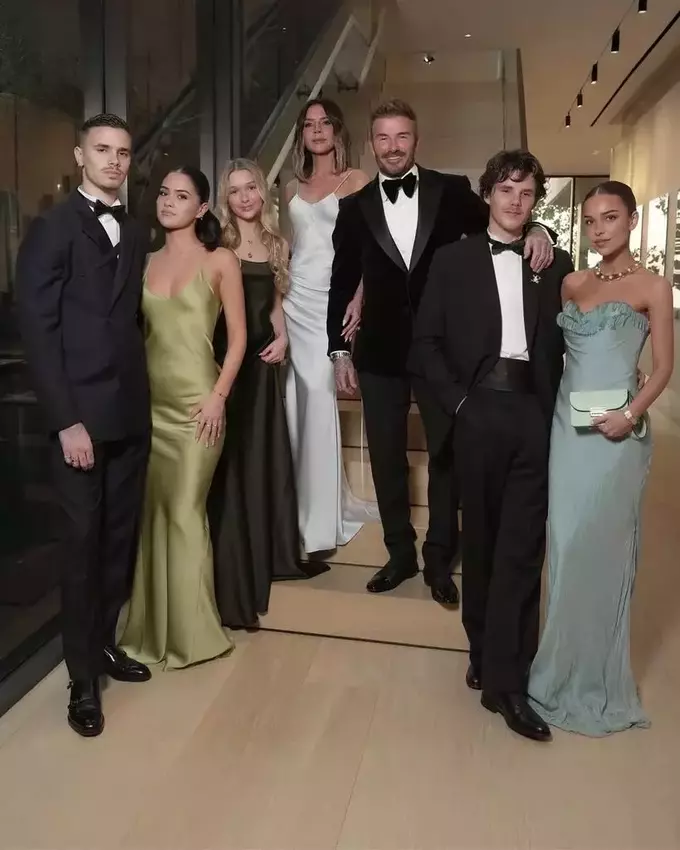 Семья Бекхэмов, особенно женщины, были в платьях от Виктории: Харпер — в коричневом, сама Виктория — в белом, а девушки Круза и Ромео — в голубом и зелёном. Дэвид и его сыновья были в смокингах.