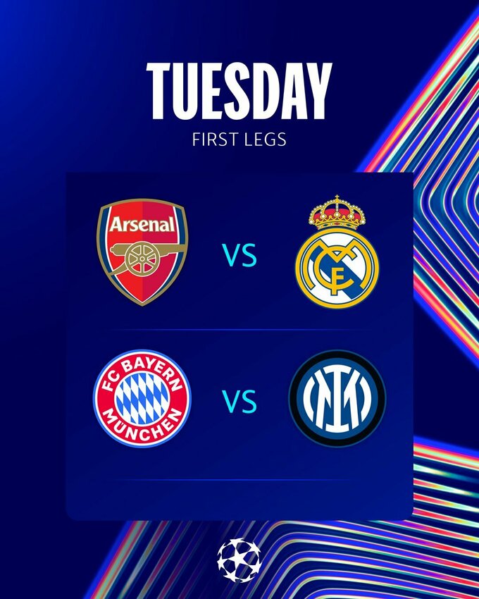 8 апреля испанский Реал с украинским голкипером Андреем Луниным на выезде сыграет против лондонского Арсенала, за который выступает украинский защитник Александр Зинченко. В этот же вечер в Мюнхене встретятся немецкая Бавария и итальянский Интер.