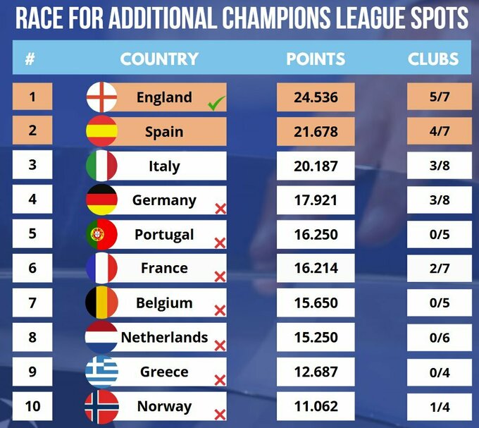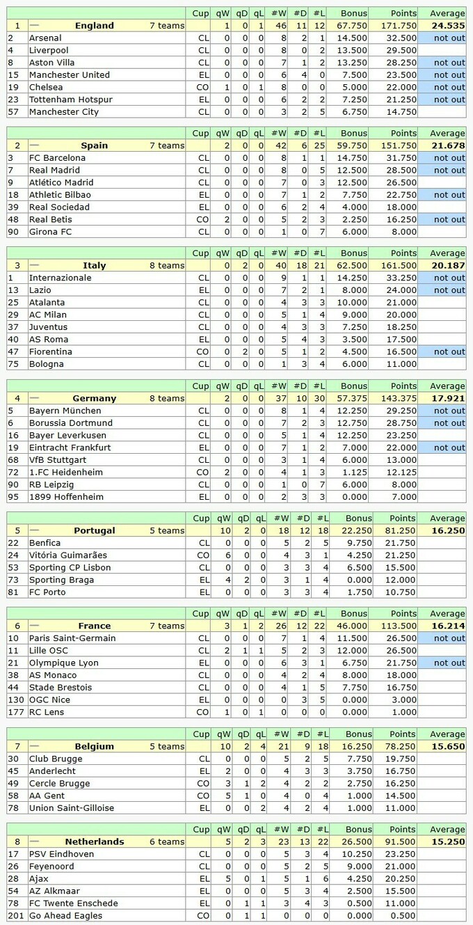 Англия математически гарантированно вошла в число двух лучших стран в евросезоне. Команда, занявшая 5-е место в Английской Премьер-лиге, получит право выступить в Лиге чемпионов.