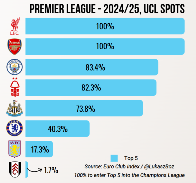 Шансы команд АПЛ 2024/25 на квалификацию в Лигу чемпионов 2025/26