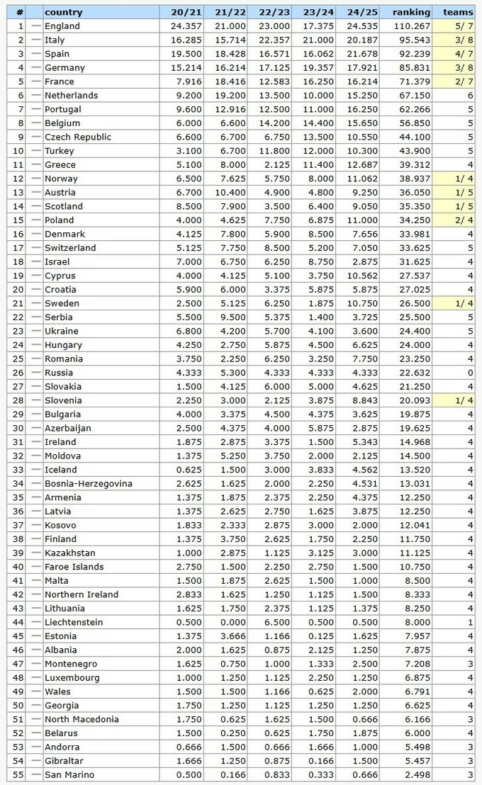 Страны-лидеры в рейтинге УЕФА за сезон 2024/25