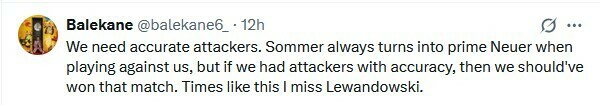 Balekane: Нам нужны забивные нападающие. Зоммер всегда превращается в главного Нойера, когда играет против нас, но если бы у нас были меткие нападающие, то мы должны были выиграть этот матч. В такие времена я скучаю по Левандовски.