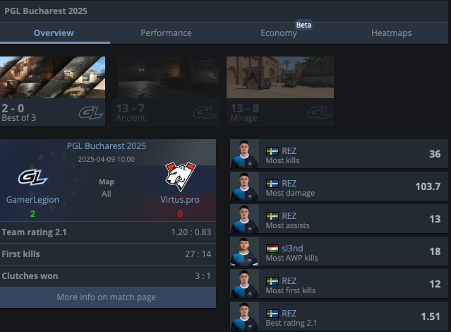 GamerLegion обыграли Virtus.pro со счётом 2:0 и стали третьей командой, пробившейся в плей-офф. Этот выход стал для клуба первым в 2025 году после нескольких неудачных попыток — 7-8 место на IEM Katowice и 9-11 на ESL Pro League. После поражения от G2 на старте турнира, команда уверенно прошла через Falcons, Legacy, а теперь и VP.