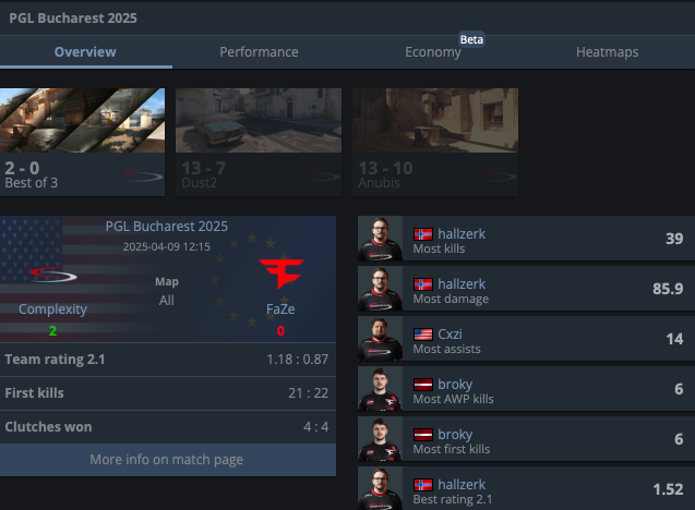 Complexity пробились в следующую стадию, обыграв FaZe со счётом 2:0. Этот матч стал особенным для Jonathan "EliGE" Jablonowski, ведь он выступал против своих бывших тиммейтов. hallzerk показал блестящую игру на Dust2 и сделал важнейший клатч на Anubis. После обидного поражения от G2 в предыдущей серии, Complexity реализовали второй шанс на максимум.