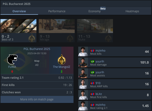 Команда победила FURIA (13:9 Mirage, 13:11 Nuke) и продолжает свой камбэк после стартовых поражений от 3DMAX и Apogee. Лидерство mzinho, набравшего 26 фрагов, стало ключом ко второй победе подряд.