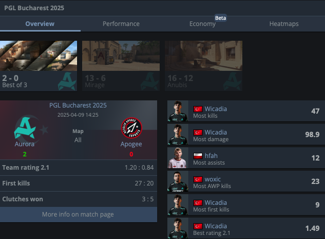 После неудачного матча с 3DMAX и сложной победы над paiN, Aurora сумели справиться с поляками. На карте Mirage Wicadia выдал рейтинг 2.02, а на Anubis интригу продлил клатч 1v2 от hypex, выполненный буквально за доли секунды до его смерти от гранаты. В итоге Aurora дожали соперника в овертайме — 4:0.