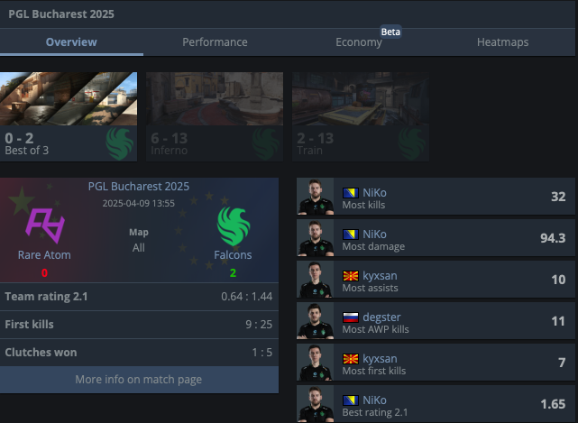 В последнем матче против Falcons они проиграли с разгромным счётом: 13-6 на Inferno и 13-2 на Train, завершив выступление на турнире.