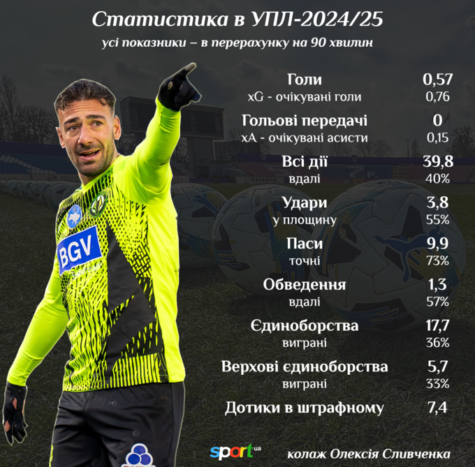 Главное, чем выделяется Факундо Батиста – это количество ударов по воротам соперника. В среднем этот показатель у уругвайца составляет 3,8 в пересчете на 90 минут чистого времени, причем больше половины попыток от Факундо приходятся в створ. И пускай в целом выборка видится еще незначительной для полноценных выводов, однако предварительный анализ позволяет утверждать, что теоретически «Полесье» обзавелось одним из наиболее опасных нападающих лиги, при правильном использовании которого команда может получить значительный голевой профит.