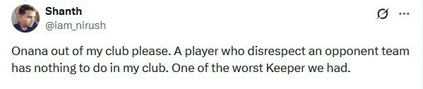 Shanth: Онана, вон из моего клуба, пожалуйста. Игроку, который не уважает команду соперника, нечего делать в моем клубе. Один из худших вратарей, которые у нас были.