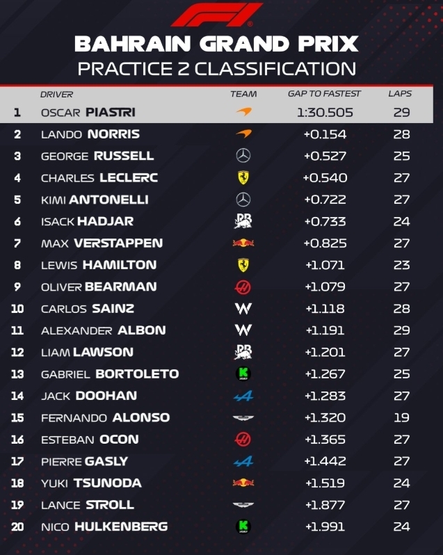 Второй силой пока что можно назвать Мерседес, однако Расселл все равно отстает от двух лидеров более чем на 0,5 секунды. Макс Ферстаппен на Ред Булле показал 7-е время, а его напарник Юки Цунода был только 18-м.