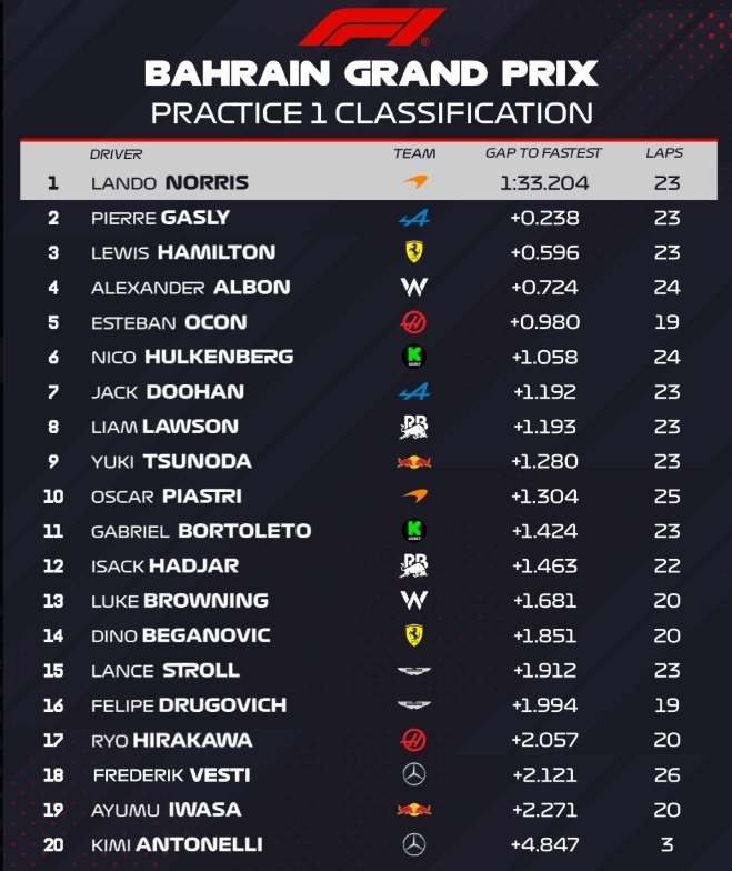 В первой тренировке лучшее время показал пилот Макларена Ландо Норрис, а топ-3 довольно неожиданно замкнули гонщики Пьерр Гасли на Альпин и пилот Уильямса Алекс Албон.